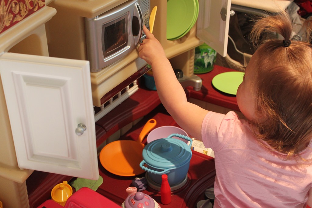 While I do laundry, C starts cooking in her kitchen. A sweet friend handed this kitchen down to us, and since our home is small, it ended up in the laundry room, which actually works out great.