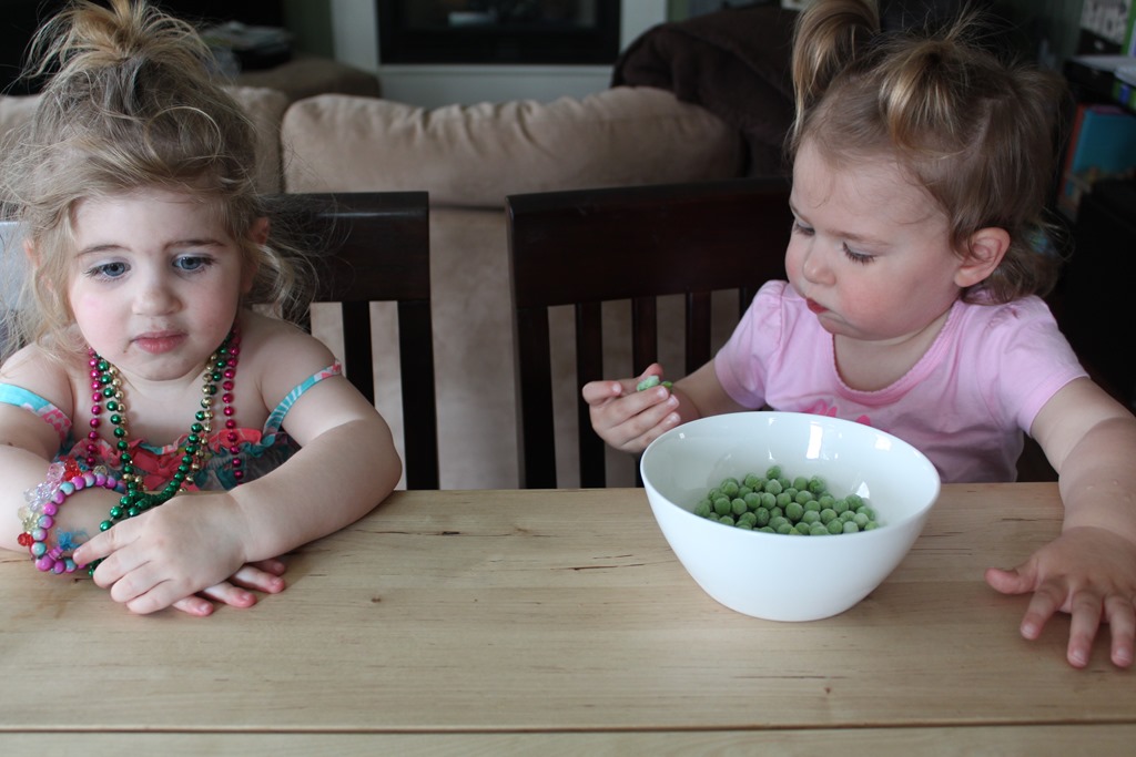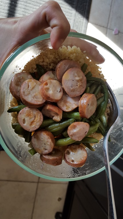 James napped from 10:55-12:30. He’s up and I nurse him and make lunch. I get out leftover peas for him and C asks for the same (um, yes, do you even have to ask?!). He eats peas, cheese, and an orange, C has peas, almond milk, fruit salad, and a banana with almond butter, She is such a chatter box which is so funny because around a lot of people she is extremely quiet. I warm up leftover quinoa and green beans, and slice up a chicken sausage and heat in the pan really quick. It’s delish! Once I eat all the chicken sausage I top the rest with feta ha.