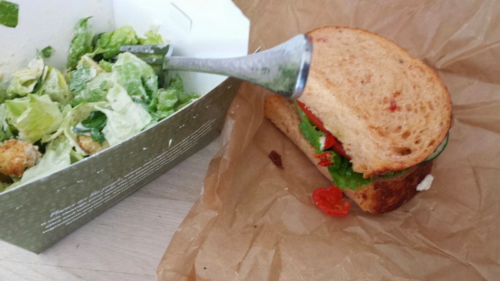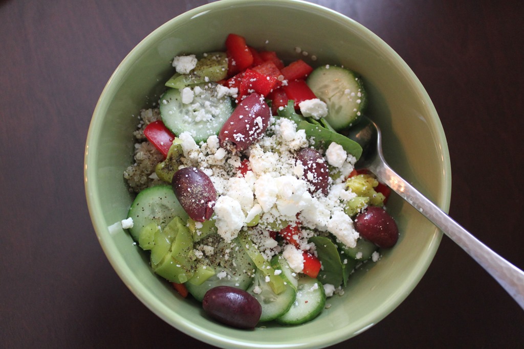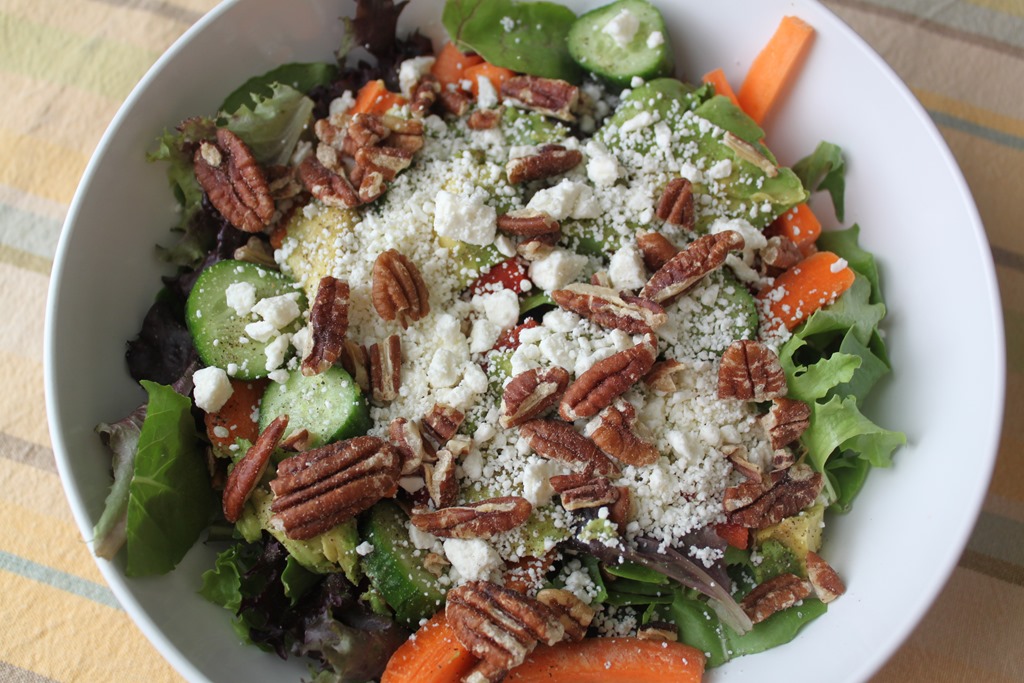 Katie is back so I make us a big salad. Spring greens, cucumbers, avocado, carrots, bell pepper, pecans, feta, and turkey. I sprinkle on a little garlic powder, sea salt and black pepper, and drizzle in some balsamic and olive oil.