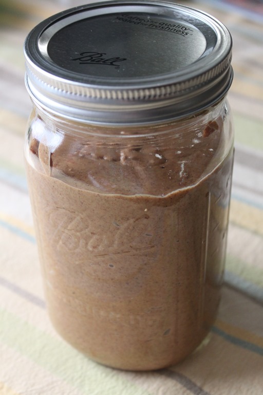 Cecelia is awake! When I come in her room she says, “Look, you don’t have clothes on.” I had on shorts and a tank top-she cracks me up. She gets changed into more summery clothes since it’s so hot, and says “tank top like Momma.” I ask if she wants a snack and remember she had requested almond butter the other day, so we make some in the food processor.
