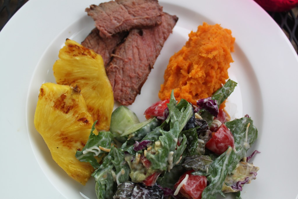 We have steak (that sadly, I didn’t love), grilled pineapple, barbeque chicken thighs, sweet potatoes, and a salad.