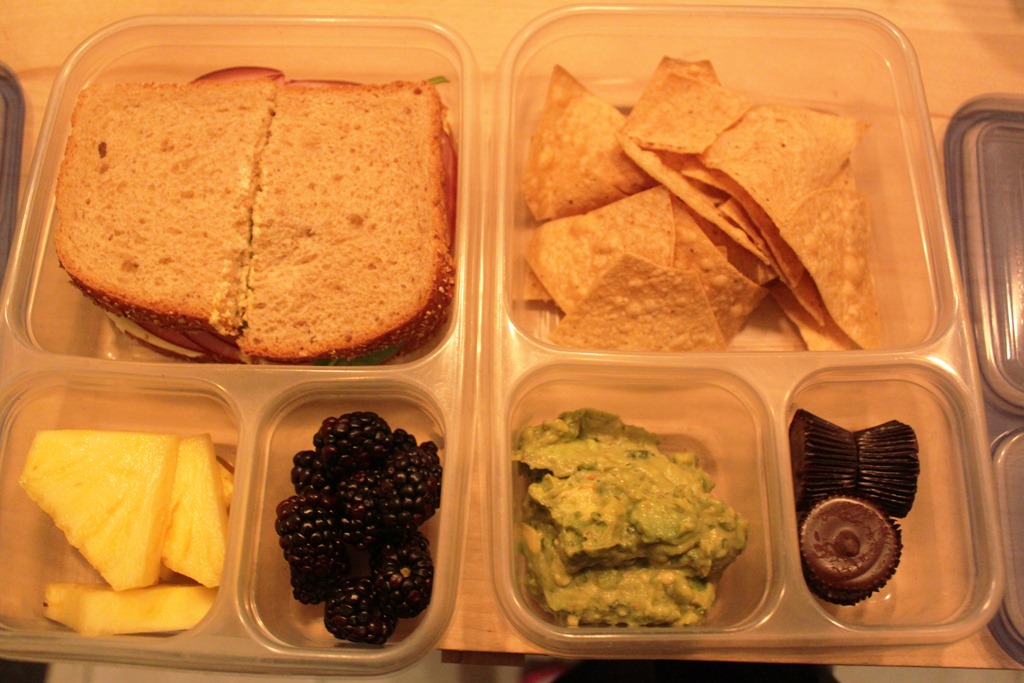 Sandwich with ham, pepperjack, spinach, mayo, and spicy mustard on whole wheat, with pineapple, blackberries, chips and guacamole, and dark chocolate peanut butter cups. Every morning he drinks a protein shake.