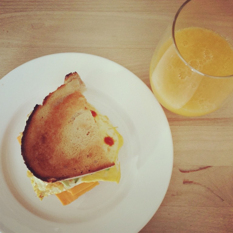 Toast with jam, cheddar, and an egg (so good), fruit and my Vitalizer.