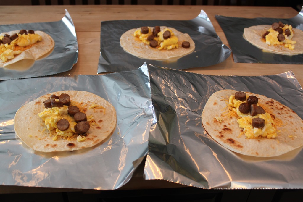 The breakfast burritos were super simple: tortillas, cheese, eggs, and Trader Joe’s breakfast chicken sausage (I actually used TJ’s maple breakfast chicken sausage that we had leftover from our breakfast that morning, so I’m saving the sweet apple for something else.)