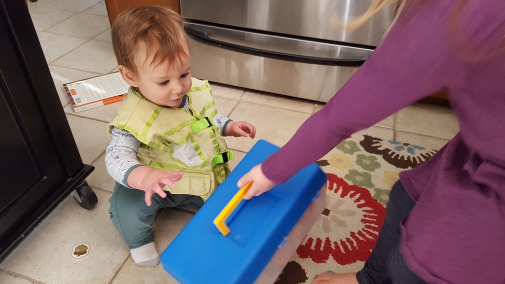 After lunch the kids play in Cece’s room while I wash the dishes and James comes out like this. Haha I love that she put this fishing vest on him!